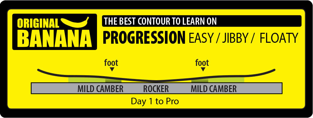 - Original Banana: rocker pomiędzy wiązaniami i delikatny camber poza nimi.  Deska jeździ i skręca intuicyjnie w każdych warunkach.