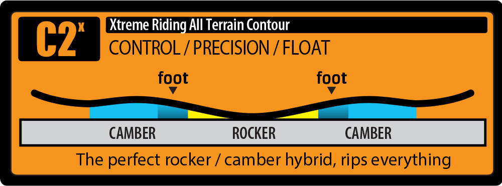 - C2X to ewolucja technologii C2. Rocker między wiązaniami jest krótszy i bardziej agresywny. Sek-cje camberowe zaczynają się już pod wiązaniami, przez co mamy jeszcze większe wsparcie przy dużych prędkościach. C2X jest przeznaczone dla średnich i zaawansowanych riderów. Mervin Mfg Patent