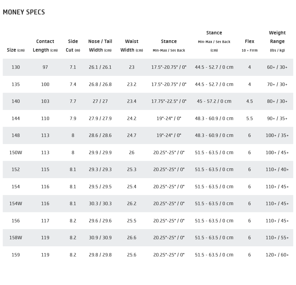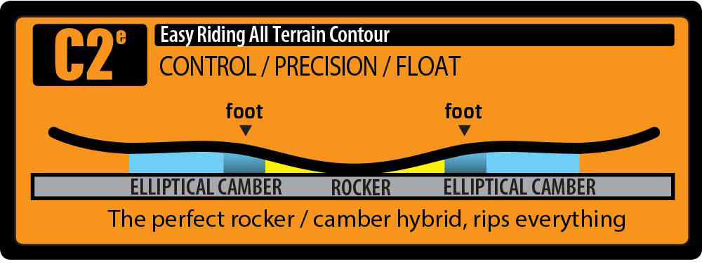- C2e to rocker pomiedzy wiązaniami i eliptyczny (łagodniejszy) camber poza nimi. Dzięki temu deska wybacza błędy i nie ogranicza rozwoju przy szybszej jeździe i nauce trików. Mervin Mfg Patent.