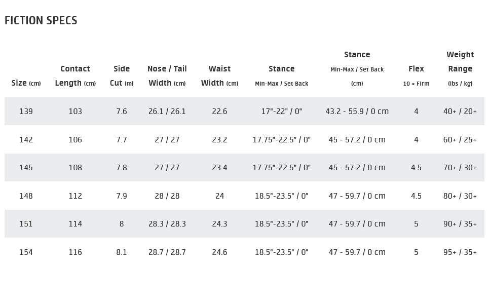 Zmiany zaszły w w profilowaniu kształtu hybrydowego, a także flexu w poszczególnych częściach deski ze względu na zastosowane drzewo. Fiction jest idealna dla średniozaawansowawnych, a także początkujących dziewczyn. Sugerowane wiązania które idealnie pasują do tej deski to:  Bent Metal model Metta.