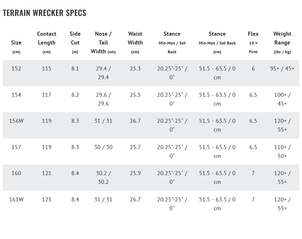 Terrain Wrecker to nowoczesny directional twin z miękkim nosem ułatwiającym jazdę w puchu i sztywniejszym tailem aby Twoje ollie było na najwyższym poziomie. Deska do wszystkiego, mająca swoje korzenie we freestylu. Każdy średnio zaawansowany rider poszukujący deski all-mountain, nie zawiedzie się na tym modelu. Sugerowane wiązania które idealnie pasują do tej deski to:  Bent Metal modele: Transfer, Axtion, Cor-Pro.