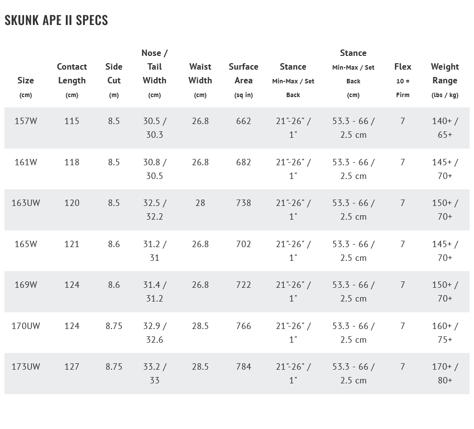 • Skunk Ape to deski dla riderów o dużych stopach, słusznego wzrostu lub dużej wadze. Model uzbrojony w długi nose, który wraz ze sporą szerokością w tali sprawi że deska będzie niezatapialna w puchu. Dzięki Horsepower udało się obniżyć wagę Skunk Ape, co j
