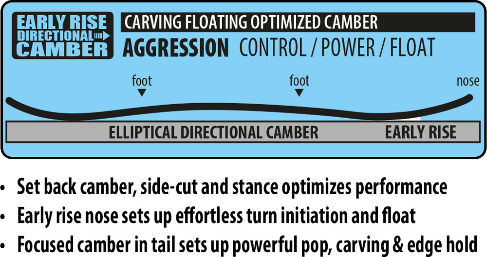 - Early rise directional camber - kierunkowy camber z łagodnie unoszącym się nose’m. Jest to bardzo agresywny kształt dla zaawansowanych riderów, którzy oczekują pełnej kontroli i bardzo szybkiej reakcji deski przy bardzo szybkiej jeździe, doskonale sprawdza się w głębokim śniegu.